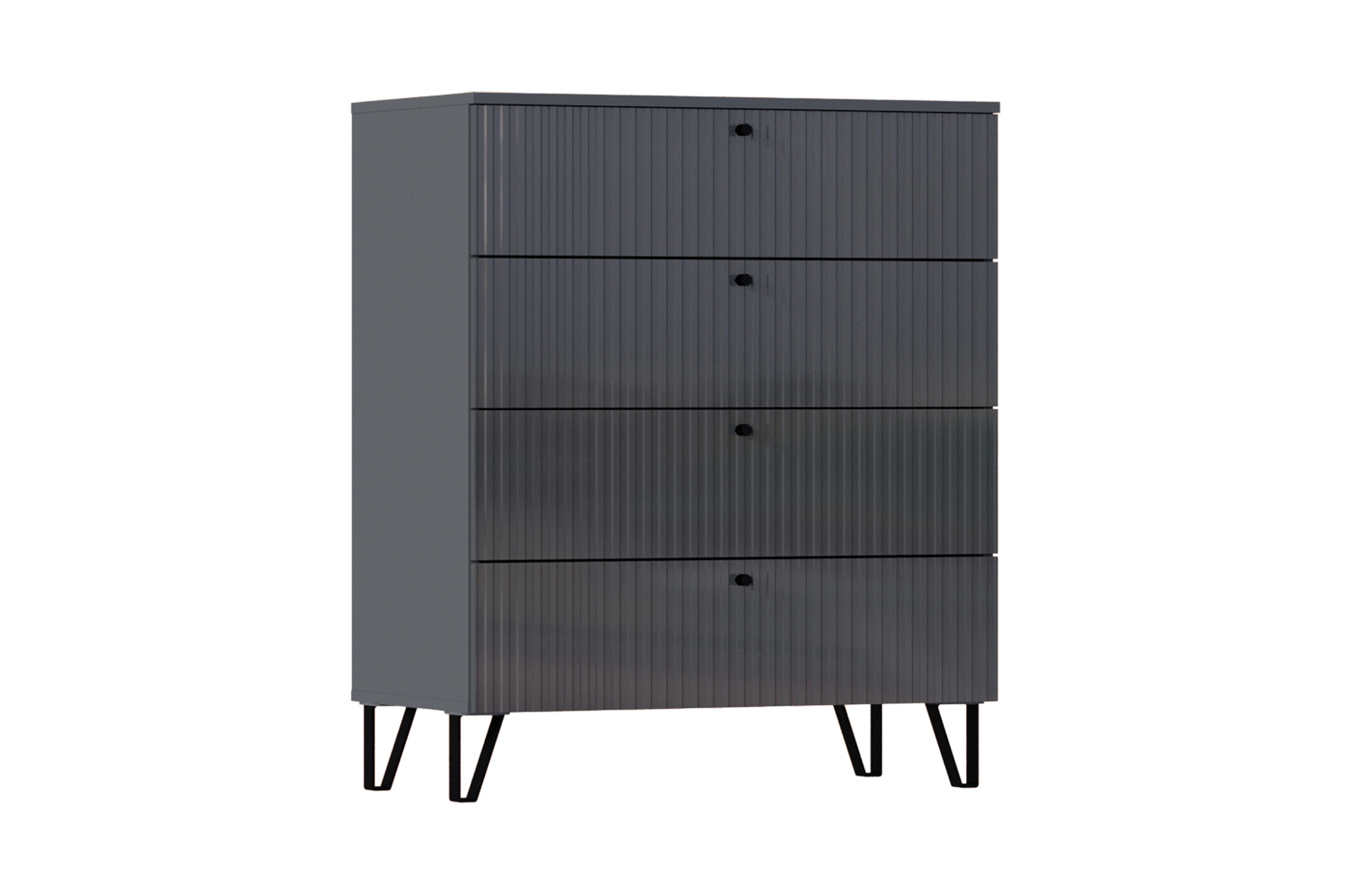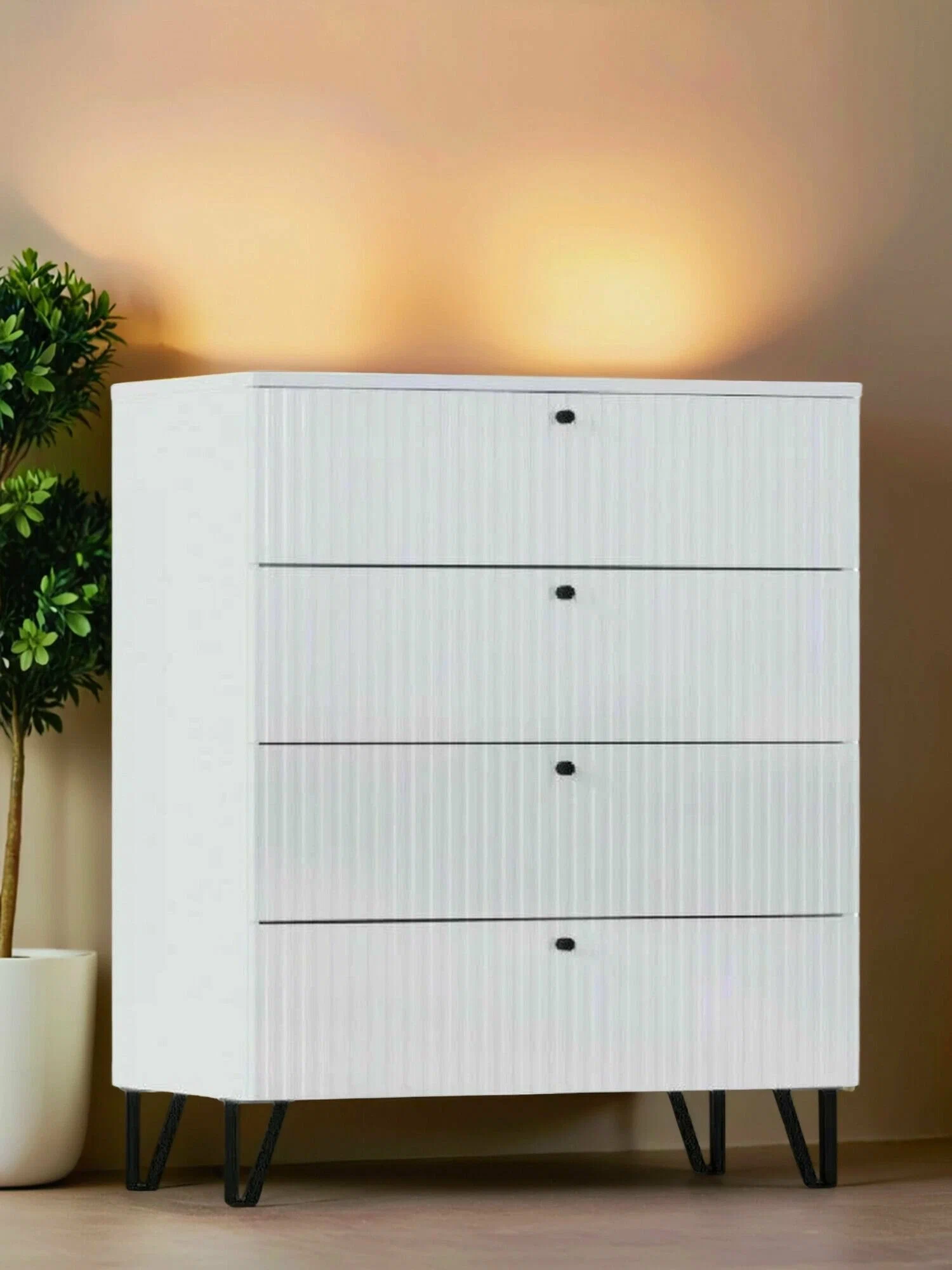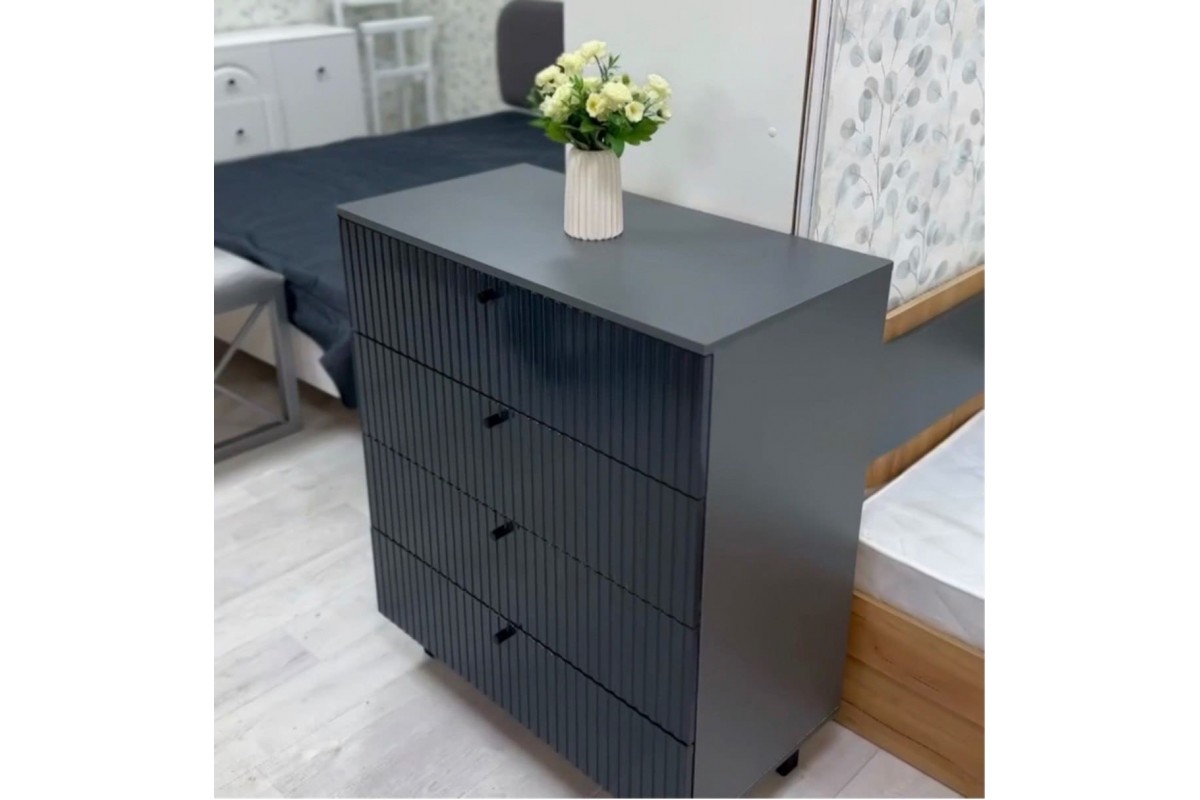 Комод «Оливия» с четырьмя выдвижными ящиками на шариковых направляющих не только будет полезен как место для хранения вещей, но и придаст оригинальность интерьеру благодаря эффектным фактурным фасадам, которые разбавляют привычную обстановку и смотрятся благородно.