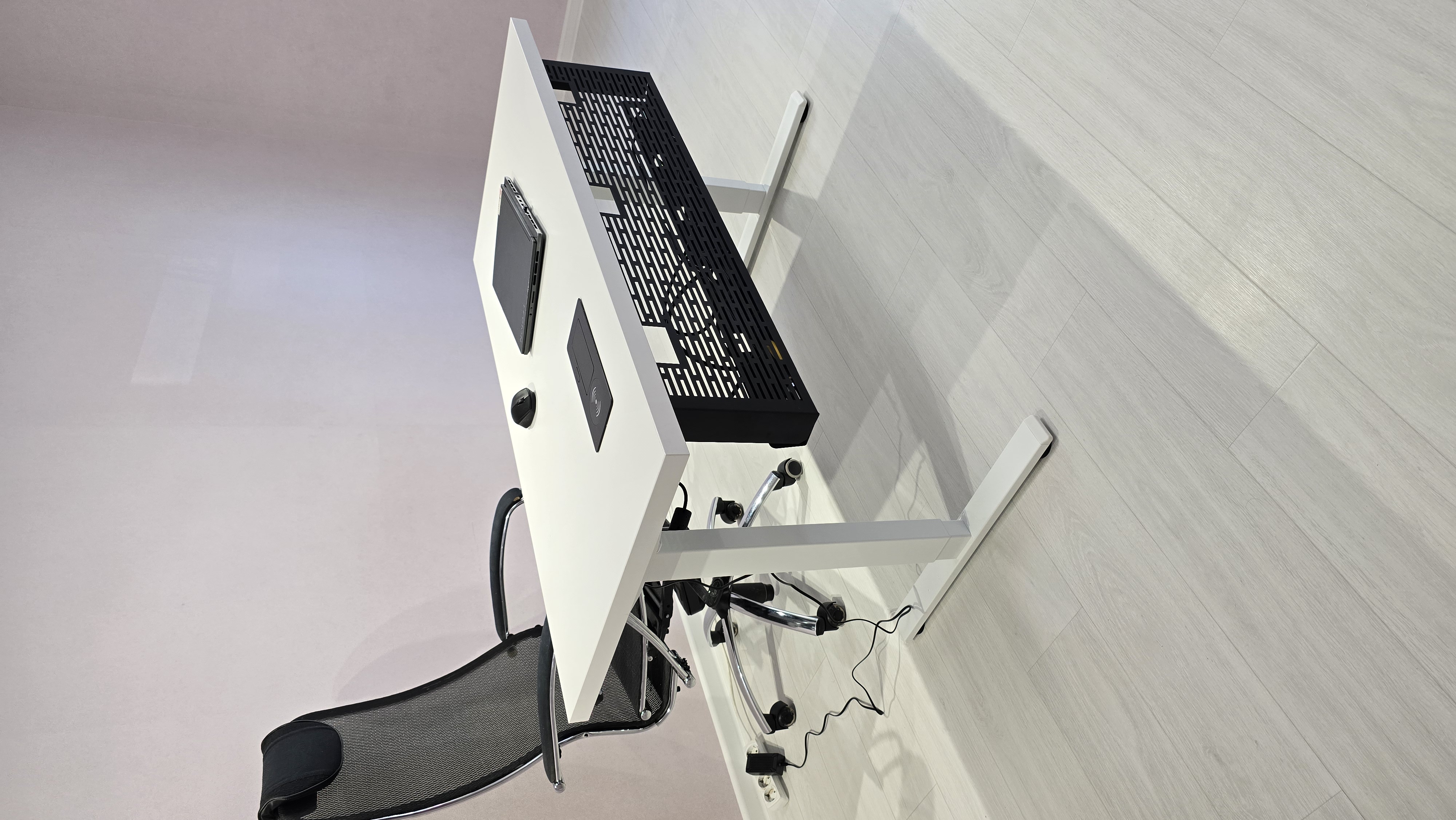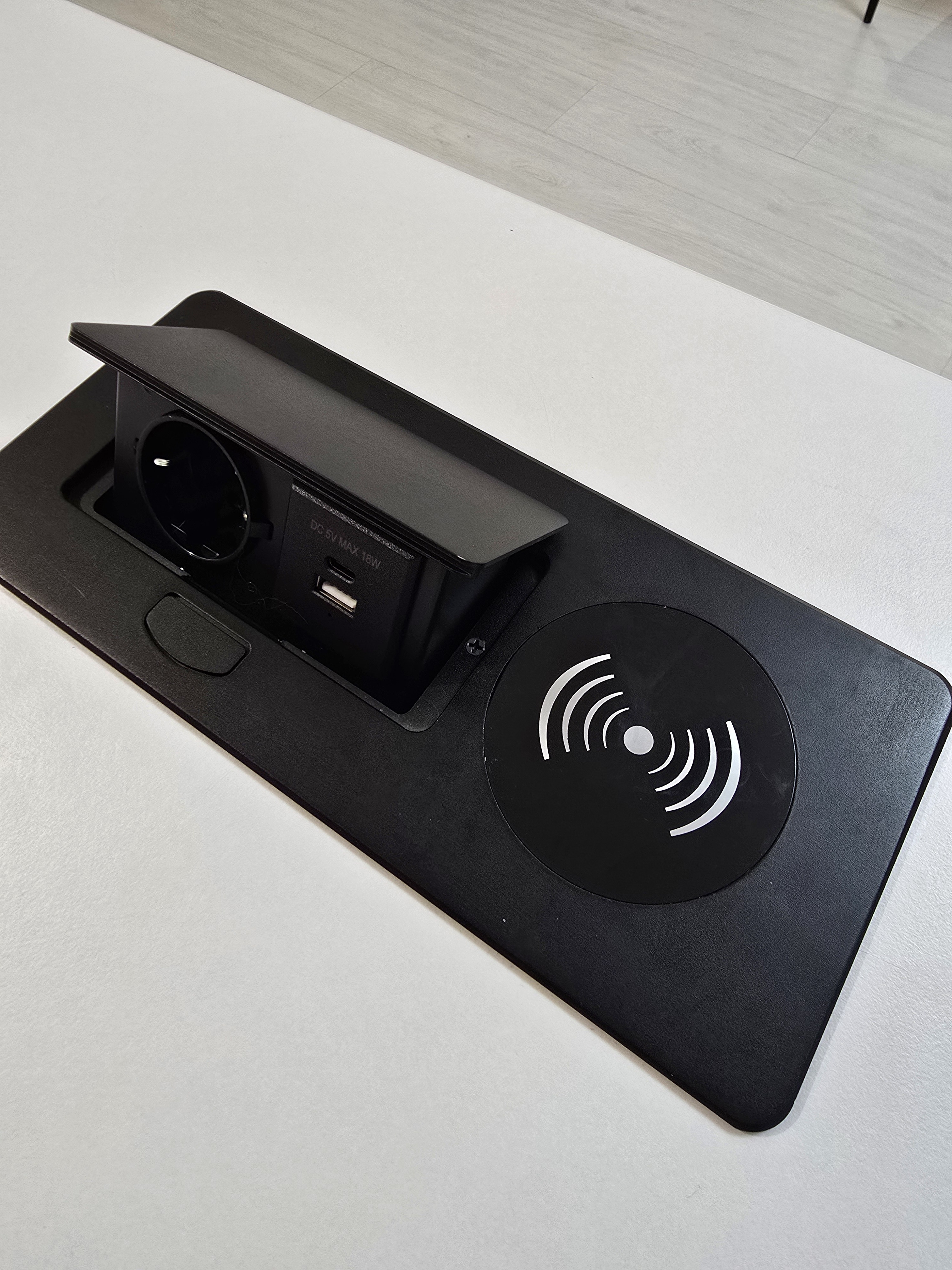 Стол можно дополнительно укомплектовать держателем для проводов и выдвижным удлинителем (розетка, USB A + C, беспроводная зарядка).