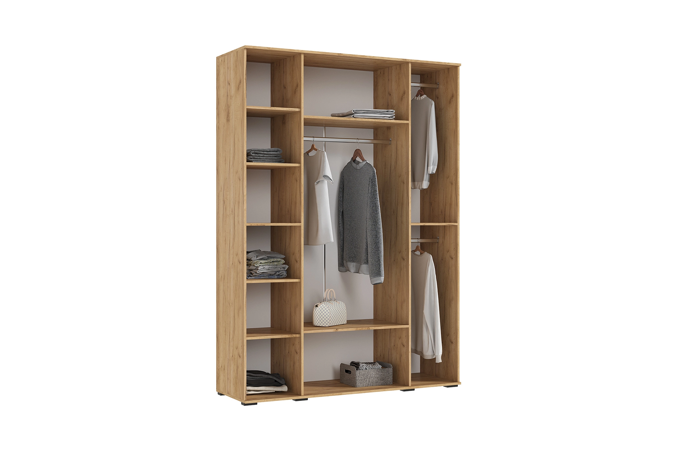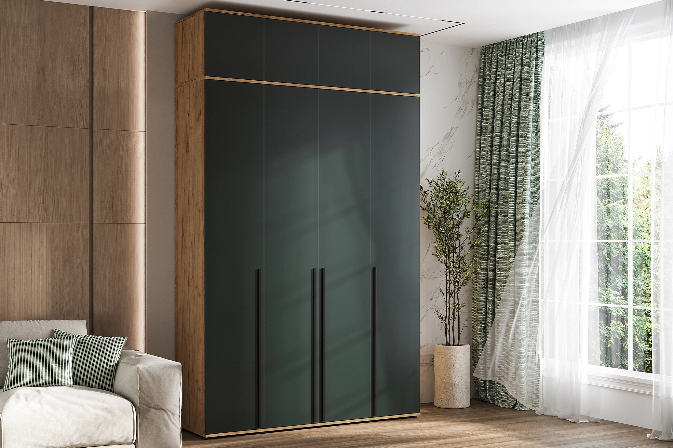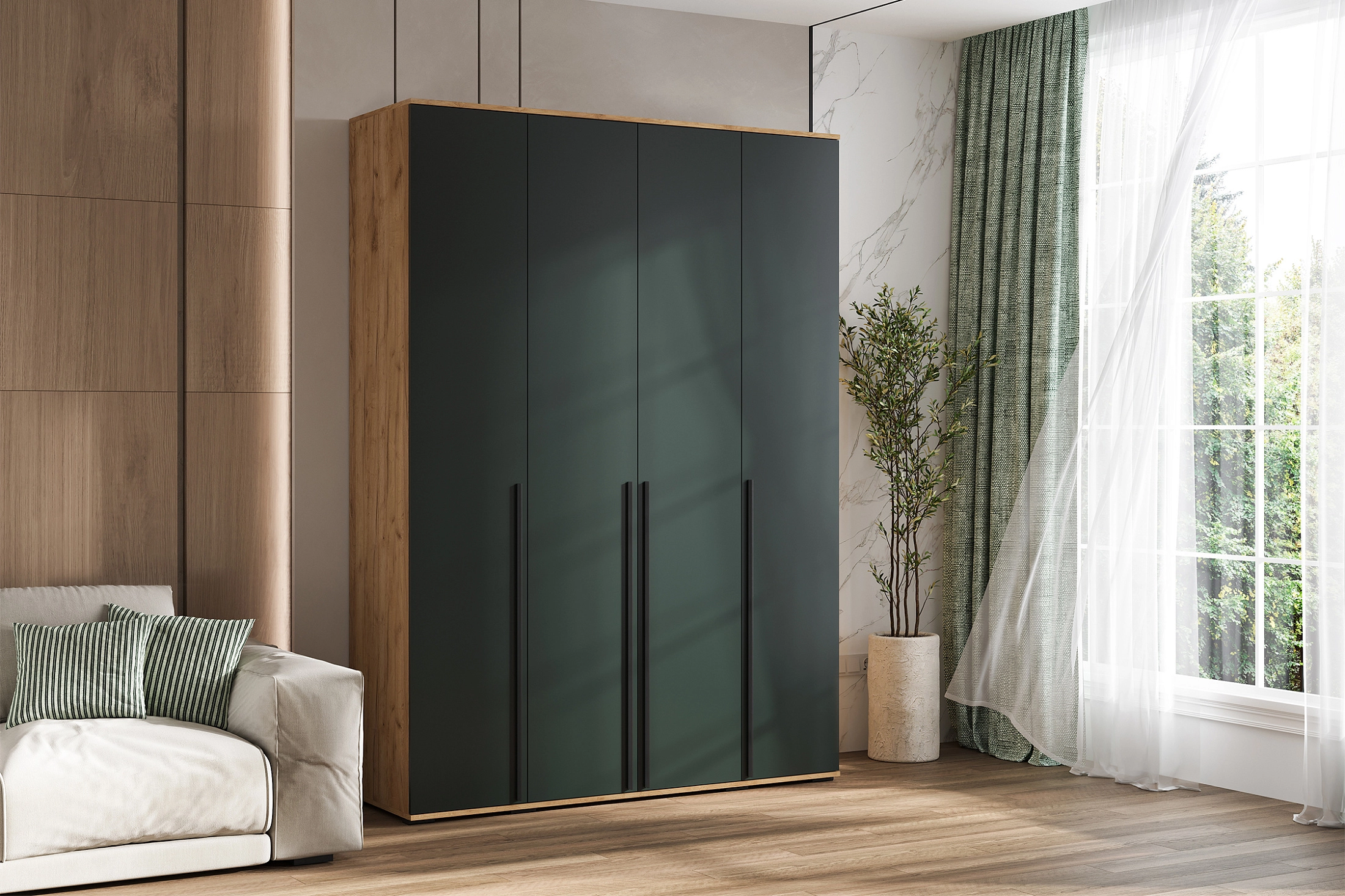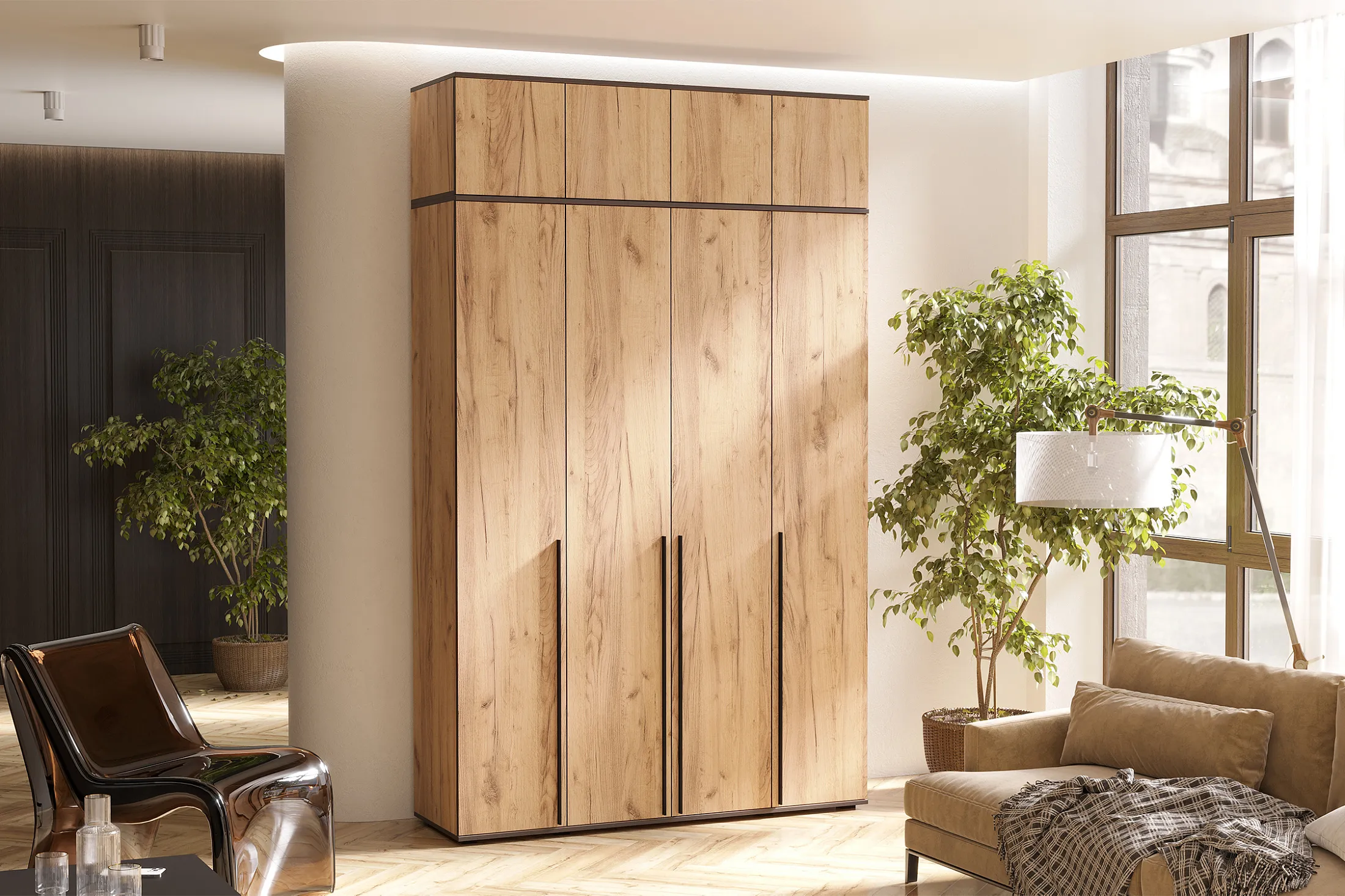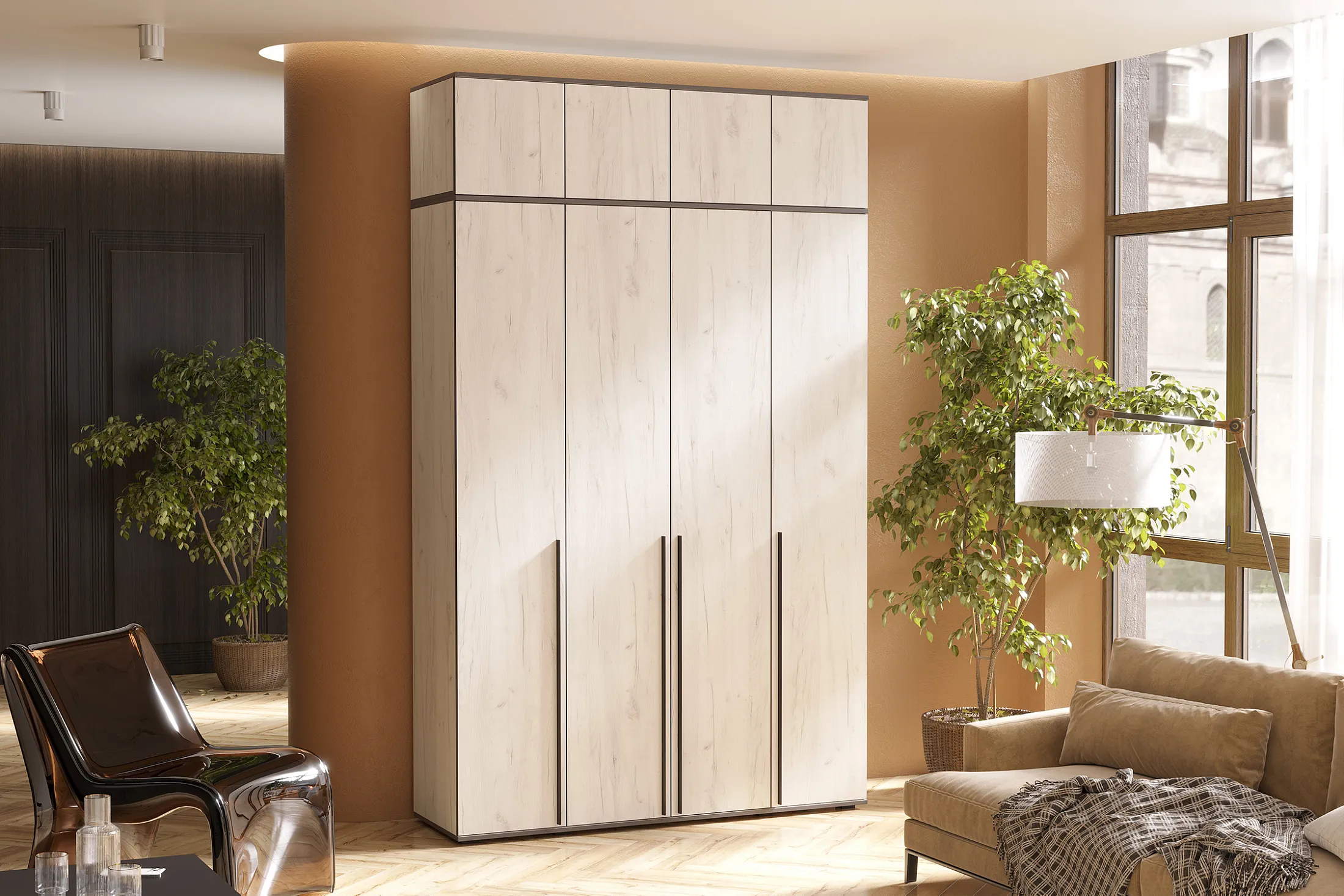 В нашем интернет-магазине вы найдете стильный четырехстворчатый шкаф "Норд" с антресолью, доступный в трех цветах: Дуб крафт, Дуб крафт белый и Графит. Этот шкаф отлично подойдет для вашей гостиной, прихожей или спальни. Фасад дверей украшают элегантные профильные ручки из черного металла. Они не только добавляют стильный акцент, но и обеспечивают удобное открывание и закрывание дверей благодаря накладным петлям. Внутри шкафа расположена широкая штанга, предназначенная для вешалок с одеждой. Полки по бокам шкафа обеспечивают удобное хранение различных предметов и аксессуаров. Антресоль шкафа разделена на три секции для организации хранения и поддержания порядка. Внутри можно разместить несезонную одежду или предметы, которые редко используются. Шкаф устанавливается на опоры черного цвета для обеспечения стабильности и надежности конструкции.
