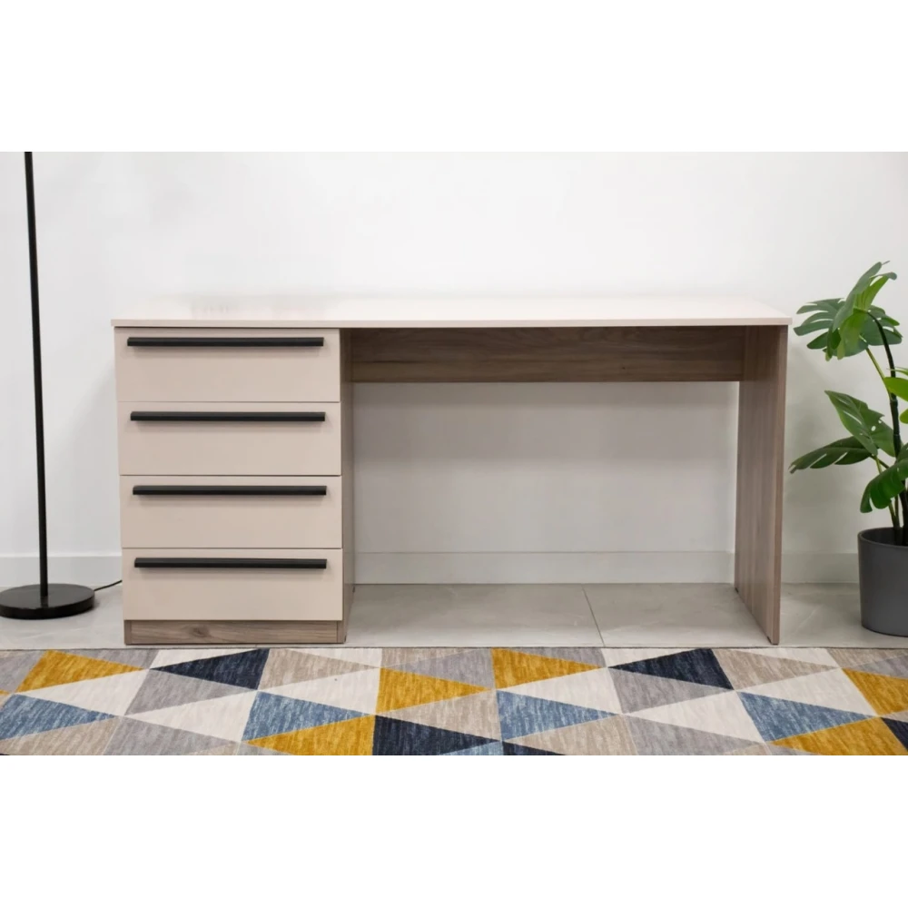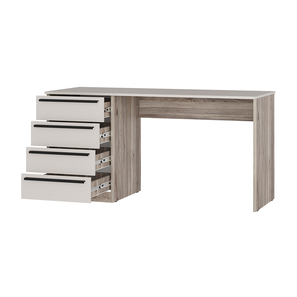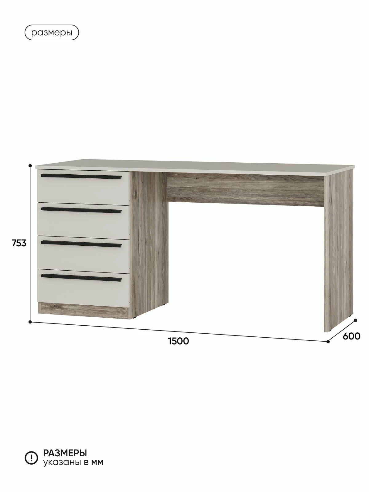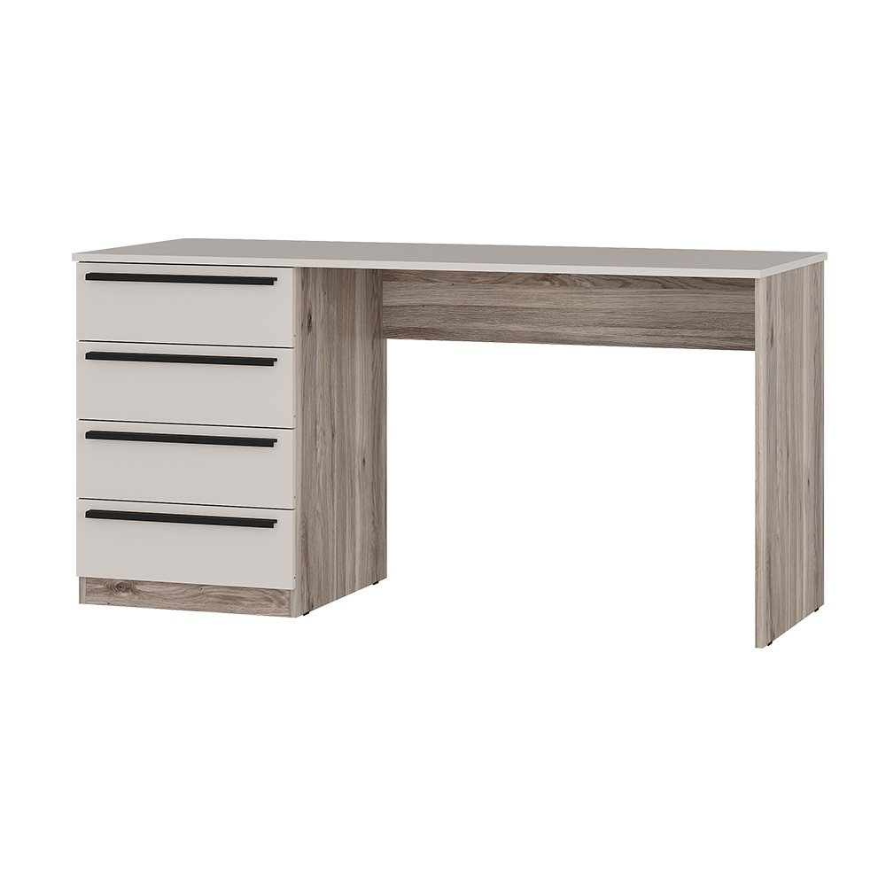Письменный стол "Урбан" – это стильный и практичный вариант для Вашего кабинета либо детской комнаты. Модуль включает в себя четыре выдвижных ящика на шариковых направляющих и широкую столешницу, что позволит создать комфортное рабочее место. Минималистичное цветовое сочетание "Дуб Смоки" и "Кашемир" добавят пространству спокойствия и тепла. В качестве дополнительного пространства для хранения можно использовать вместительные ящики с эргономичными пластиковыми накладными ручками черного цвета (430 мм).