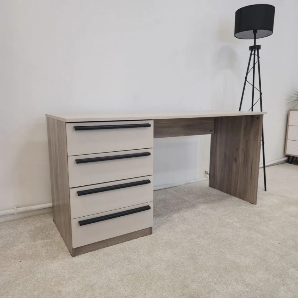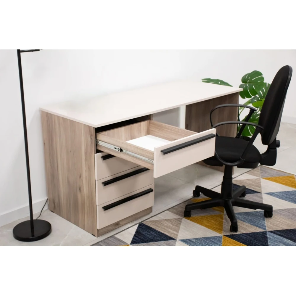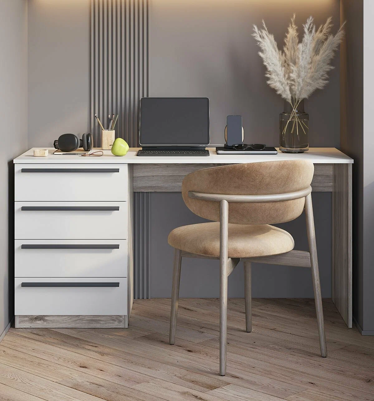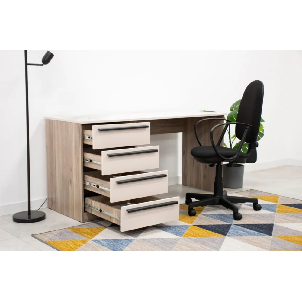 Письменный стол "Урбан" – это стильный и практичный вариант для Вашего кабинета либо детской комнаты. Модуль включает в себя четыре выдвижных ящика на шариковых направляющих и широкую столешницу, что позволит создать комфортное рабочее место. Минималистичное цветовое сочетание "Дуб Смоки" и "Кашемир" добавят пространству спокойствия и тепла. В качестве дополнительного пространства для хранения можно использовать вместительные ящики с эргономичными пластиковыми накладными ручками черного цвета (430 мм).